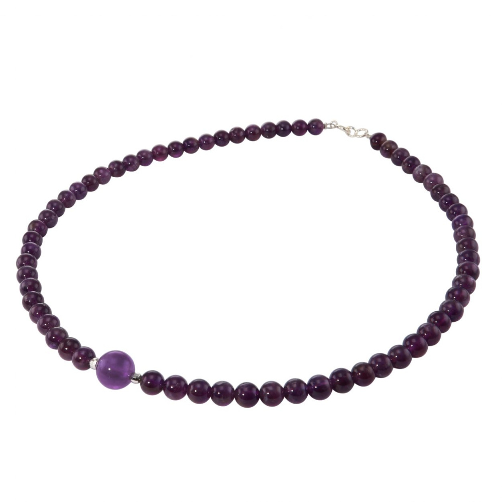 Ce collier est composé de boules de 6mm en Améthyste, de 2 perles facettées en Argent de 4mm de diamètre et d'une perle 10mm en Améthyste en son centre