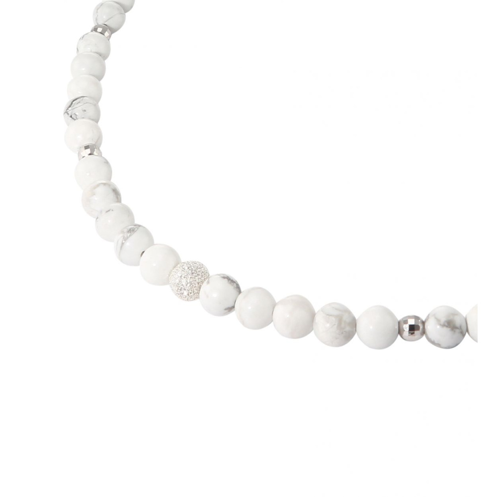 Incarnant la pureté et l'élégance féminine, ce collier en argent sublimera toutes vos tenues vestimentaires avec style et personnalité. Il est joliment agrémenté de plusieurs boules d'howlite blanches qui parcourent tout le long de la monture. Les pierres fines sont alternées par quelques perles d'argent à finition facettée et martelée. L'ensemble est monté sur un câble solide qui se referme avec un anneau à ressort classique en argent.