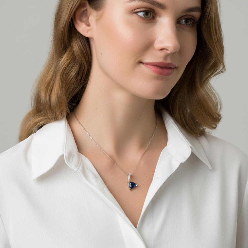 Un raffinement exceptionnel et une aura très féminine se dégagent de ce superbe pendentif en or blanc. À offrir aux femmes les plus amatrices d'élégance, le bijou captive le regard par son design moderne et original. La monture prend la forme d'une tige d'or sur laquelle est accolé un saphir taillé en trillion et maintenu de l'autre côté par une griffe.