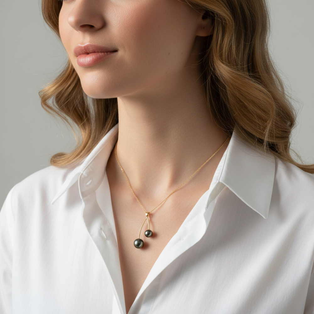 Mettez en valeur votre décolleté et donnez un coup d'éclat à votre peau en vous parant de cet exquis pendentif en or jaune. À porter lors des occasions les plus spéciales pour sublimer une belle robe, le bijou est constitué de deux tiges d'or sur lesquelles sont suspendues deux merveilleuses perles de culture de Tahiti. Celles-ci sont appréciées et on les reconnaît par leur profonde couleur noire qui semble cacher un mystère. Les perles de culture à la rondeur parfaite captureront tous les regards.