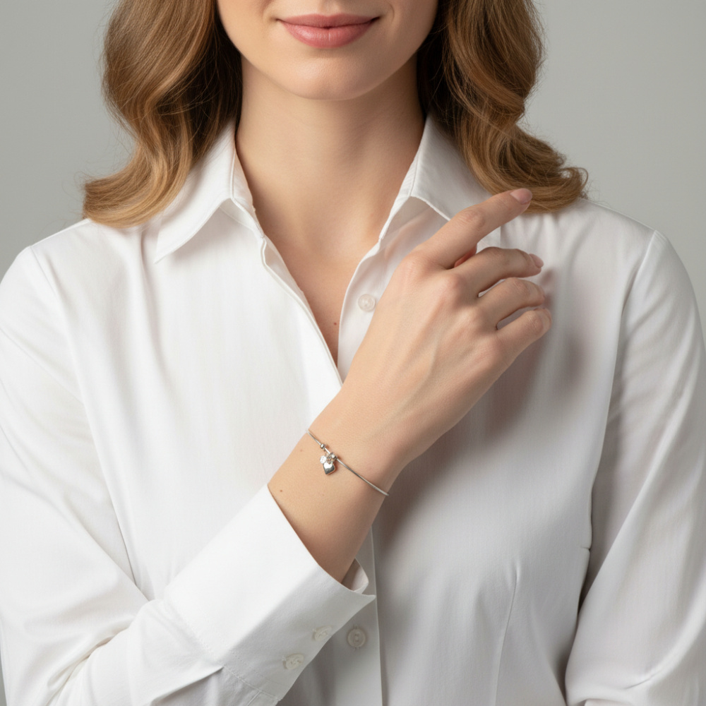 Le bracelet en argent rhodié arbore un anneau à section ronde sur lequel trônent deux breloques en forme de coeur.
