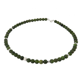 Pierre de noblesse en Chine, le jade s'inscrit parmi les minéraux les plus prisés et recherchés en joaillerie. Il habille élégamment ce bracelet pour femme et apporte une aura naturelle par sa profonde couleur verte. Les pierres ont été taillées en boule et en cabochon puis elles ont été fixées sur un câble en acier équipé d'un fermoir à anneau et à ressort en argent. Le centre du bijou s'habille d'une perle de jade plus grande et entourée de deux perles facettées d'argent.