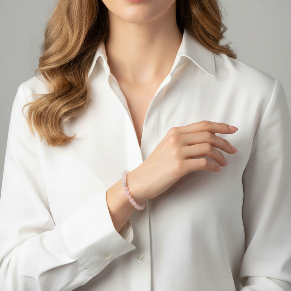 Ce bracelet est parsemé de plusieurs quartz roses taillés en boule.