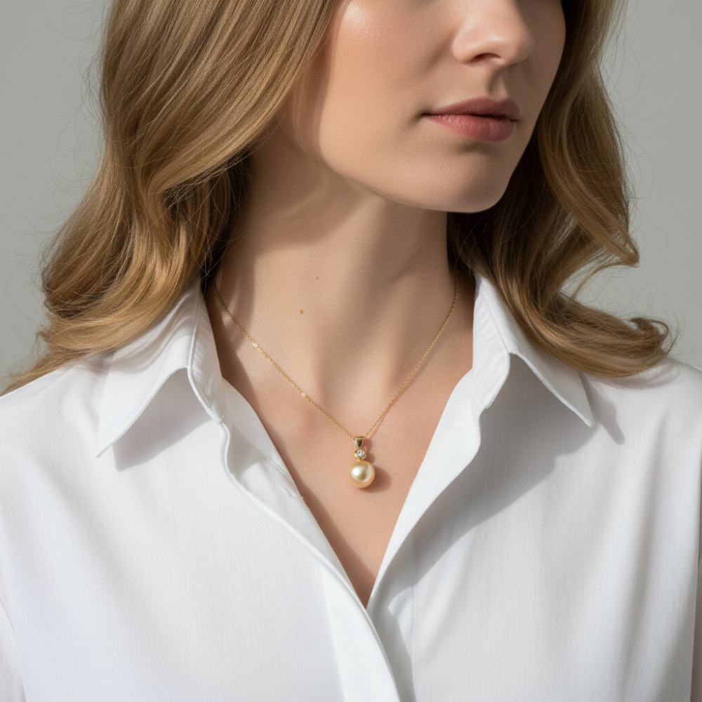 Issue de la Pinctada Maxima à lèvre dorée, une huître généralement trouvée aux Philippines, en Australie ou en Indonésie, la perle de culture gold donne une aura élégante et féminine à ce pendentif inédit. La perle de culture de couleur champagne possède une épaisse nacre qui confère un éclat unique au bijou. Le sommet de ce pendentif est doté d'une bélière au-dessous de laquelle trône un lumineux diamant blanc qui est fixé par un solide serti-clos