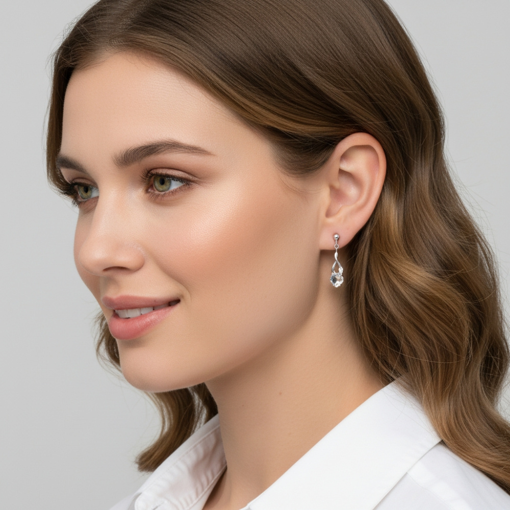 Le bijou arbore un style pendant qui affine le visage de sa propriétaire.