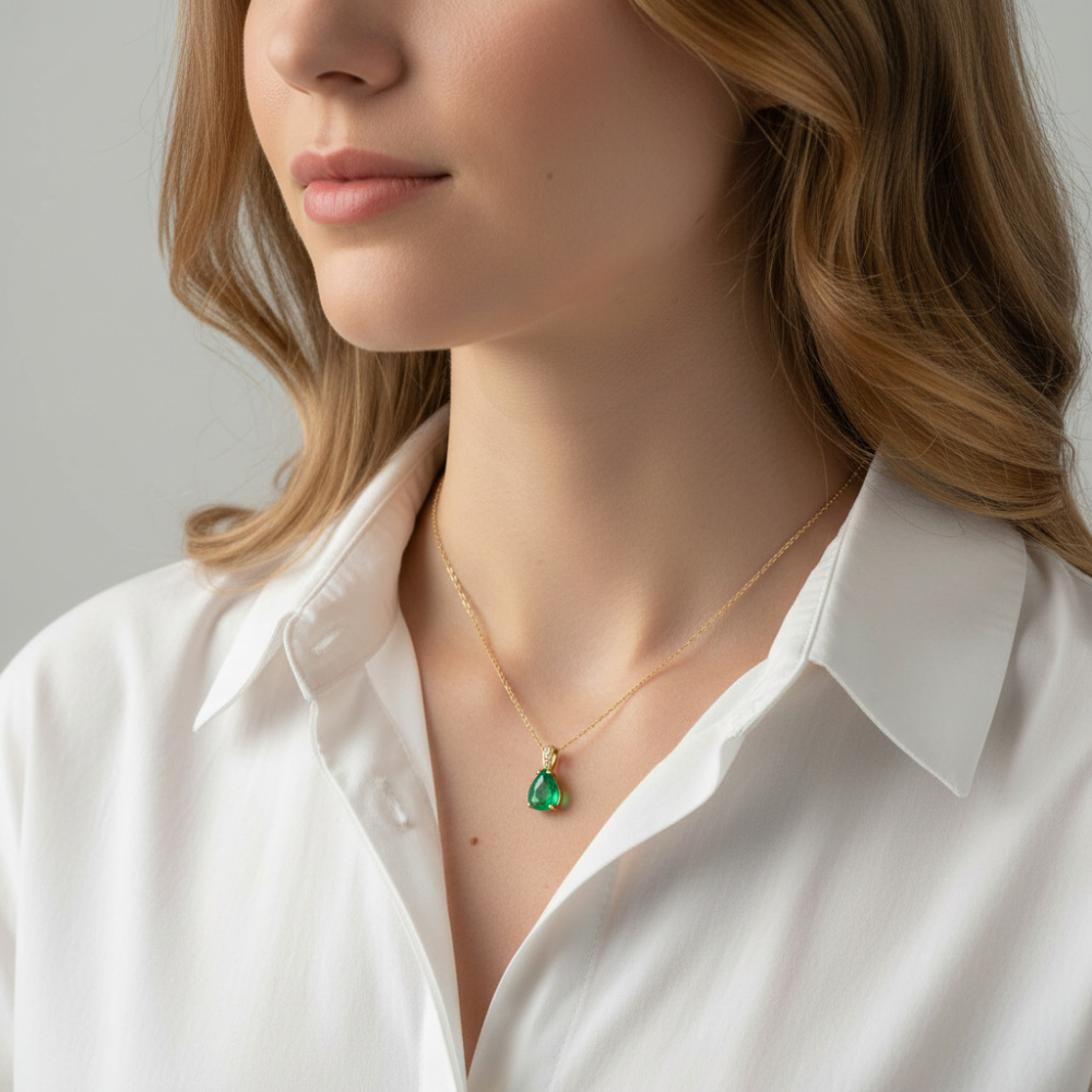 Pendentif en Or Jaune 750 serti d'une Emeraude poire de 9x7mm (1.5 carat) et de 3 diamants