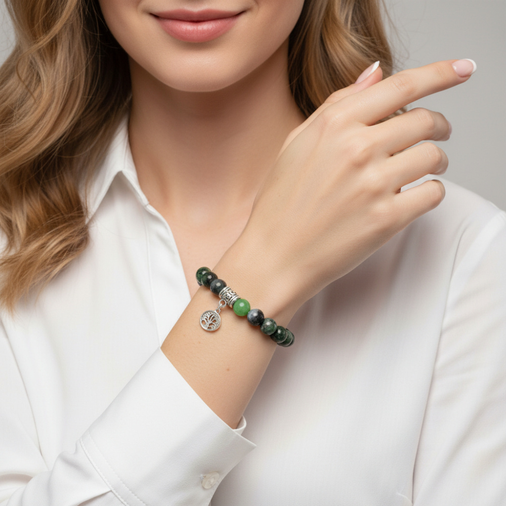 Toutes les femmes dans l'air du temps se plairont à arborer ce bracelet orné d'une myriade de perles de rubis zoisïte qui sont montées sur un élastique pour convenir à toutes les tailles de poignet. La pierre attire l'attention pour ses nuances de vert avec des inclusions de hornblende noire et opaque qui la rendent parfaitement originale. Pour une touche encore plus exclusive, le centre du bracelet est sublimé par une breloque arbre de vie qui incarne l'amour, la protection et l'éternité.