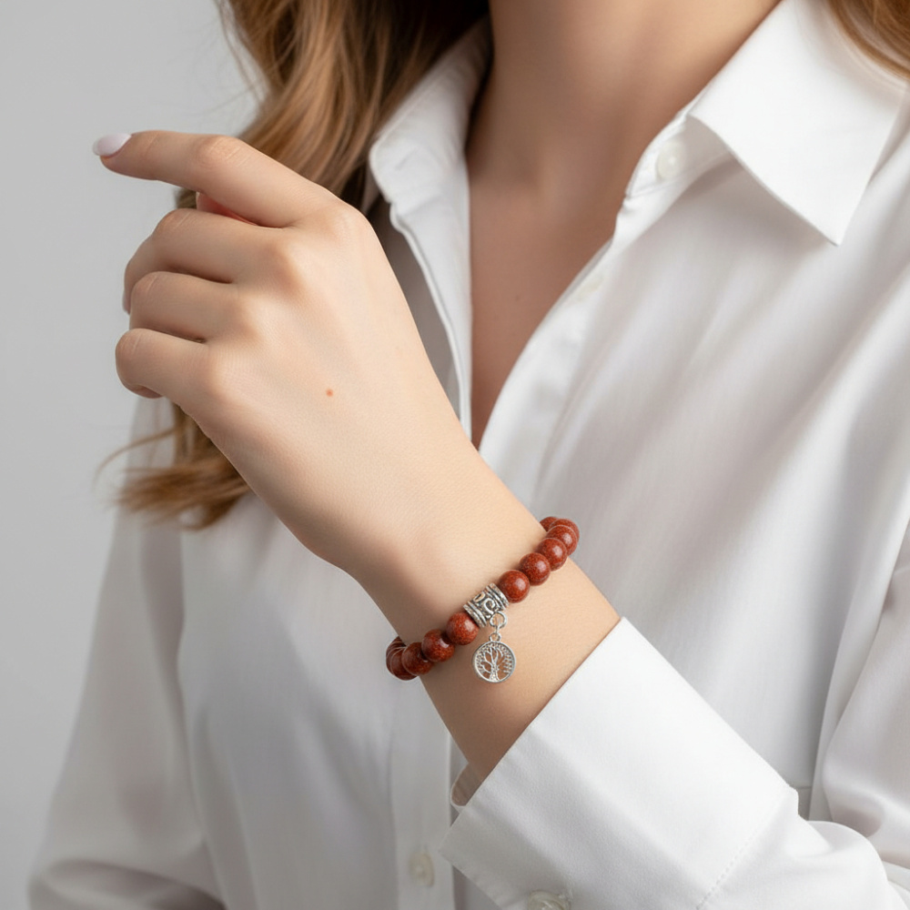 Si vous cherchez à affirmer un style original au quotidien, il vous suffit de vous parer de ce bracelet intemporel et chic. Le bijou incarne l'élégance au naturel en se parant de 23 perles de cuivre rouge qui attirent le regard par leur couleur harmonieuse et puissante. Le centre du bracelet est assorti d'une breloque inspirée de l'arbre de vie qui laisse transparaître ses branches et son tronc, comme un lien entre le terrestre et le céleste.