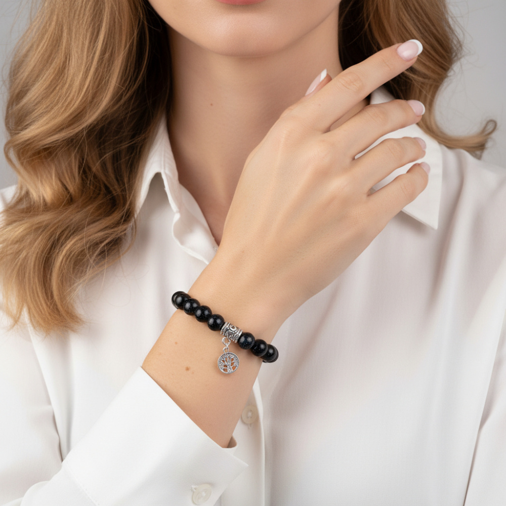 Ce Bracelet est composé de 23 perles de 8mm et d'une breloque en métal représentant un arbre de vie