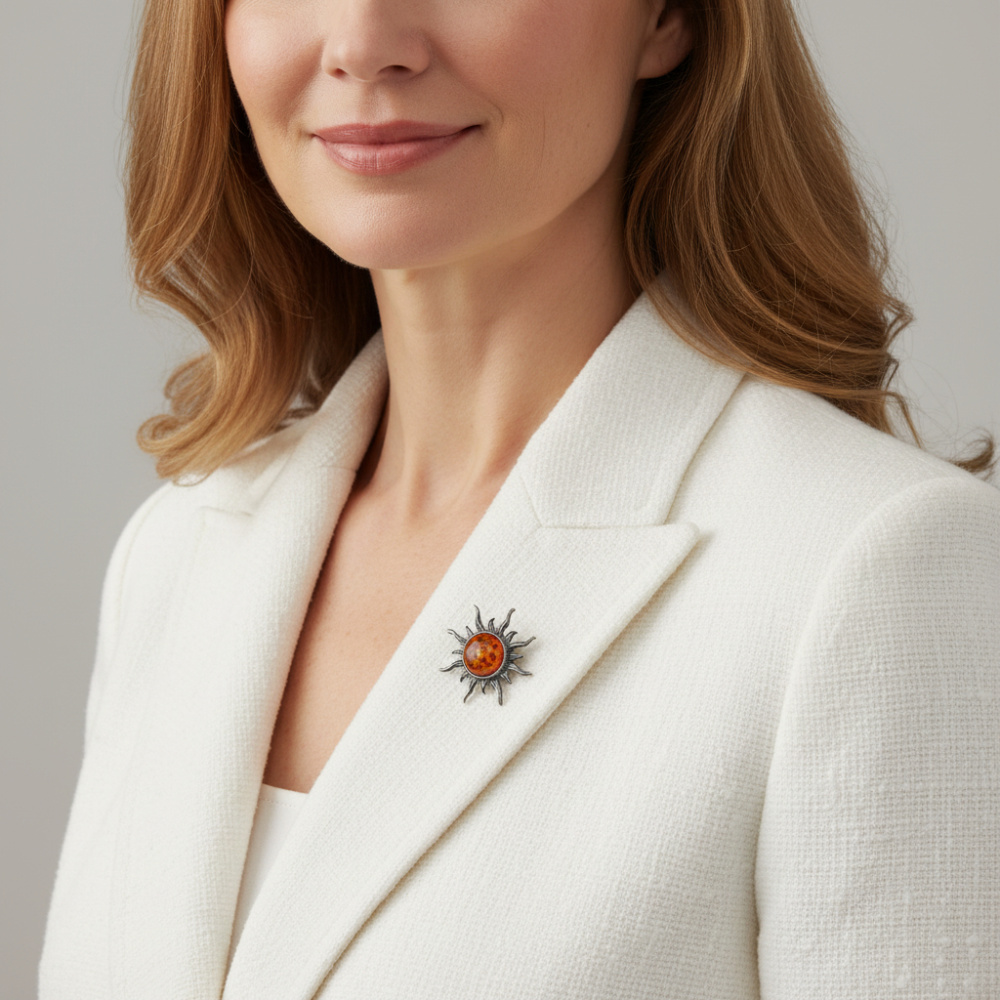 Cette broche argentée incarne la chaleur du soleil avec un magnifique ambre au centre et ses superbes rayons solaires. La pierre d'ambre, d'une teinte chaleureuse, est délicatement encerclée par une monture en argent pour former une broche élégante et lumineuse. Cet accessoire apporte une touche de sophistication à n'importe quel vêtement tout en évoquant l'éclat du soleil dans un style poétique. Ce bijou particulier est un choix parfait pour toutes celles qui recherchent un accessoire à la fois chic et intemporel.
