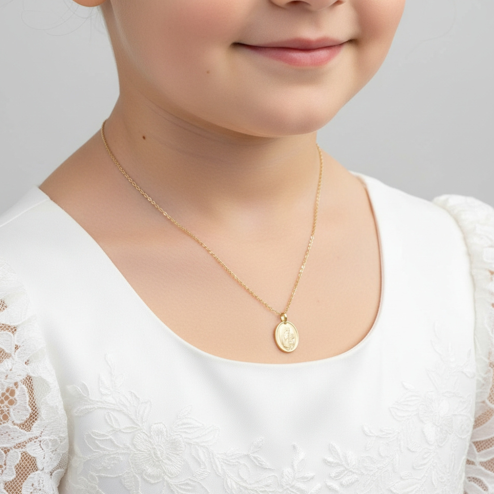 Cette médaille de la Vierge à l'enfant en or jaune trouve son inspiration dans l'art religieux et capture la tendre image de la Vierge Marie également connue sous le nom de « Madone » tenant délicatement dans ses bras l'Enfant Jésus. Cette représentation évoque une scène empreinte de spiritualité liée à la nativité et à la maternité. La Vierge et l'Enfant arborent une finition brillante qui met en valeur les détails gracieux de cette représentation religieuse. La partie entourant la scène centrale est subtilement satinée.