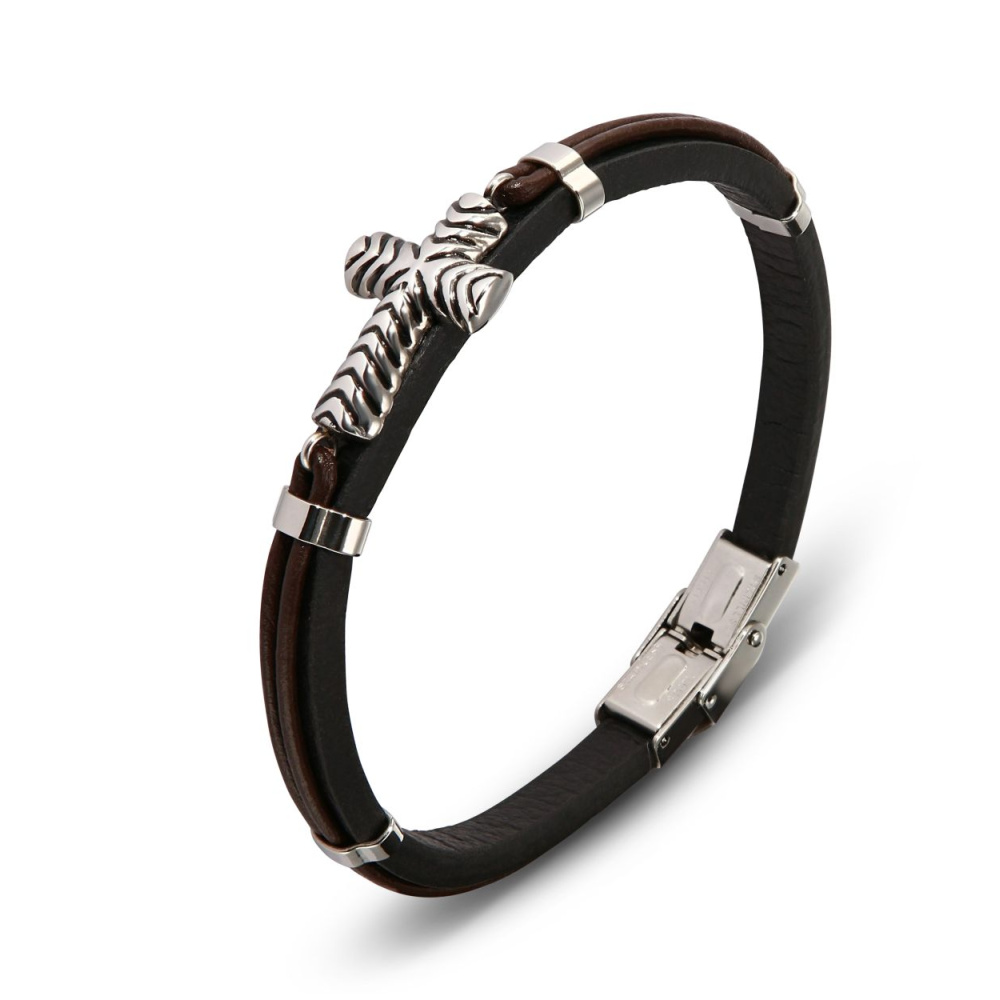 Bracelet homme en similicuir noir et marron composé de 4 motifs en acier et une croix acier de 15x23mm