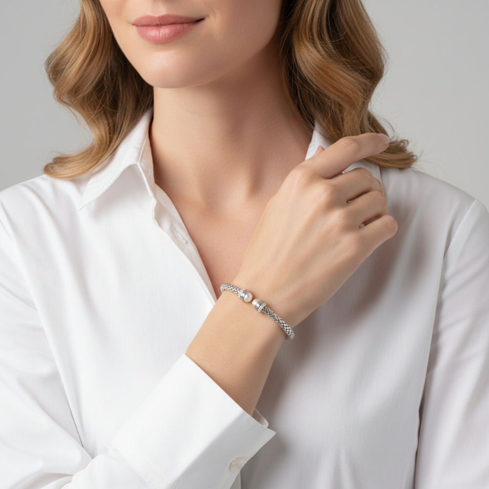Bracelet jonc en argent rhodié 925 composé d'une maille fantaisie, de 2 perles de culture et d'oydes de zirconium