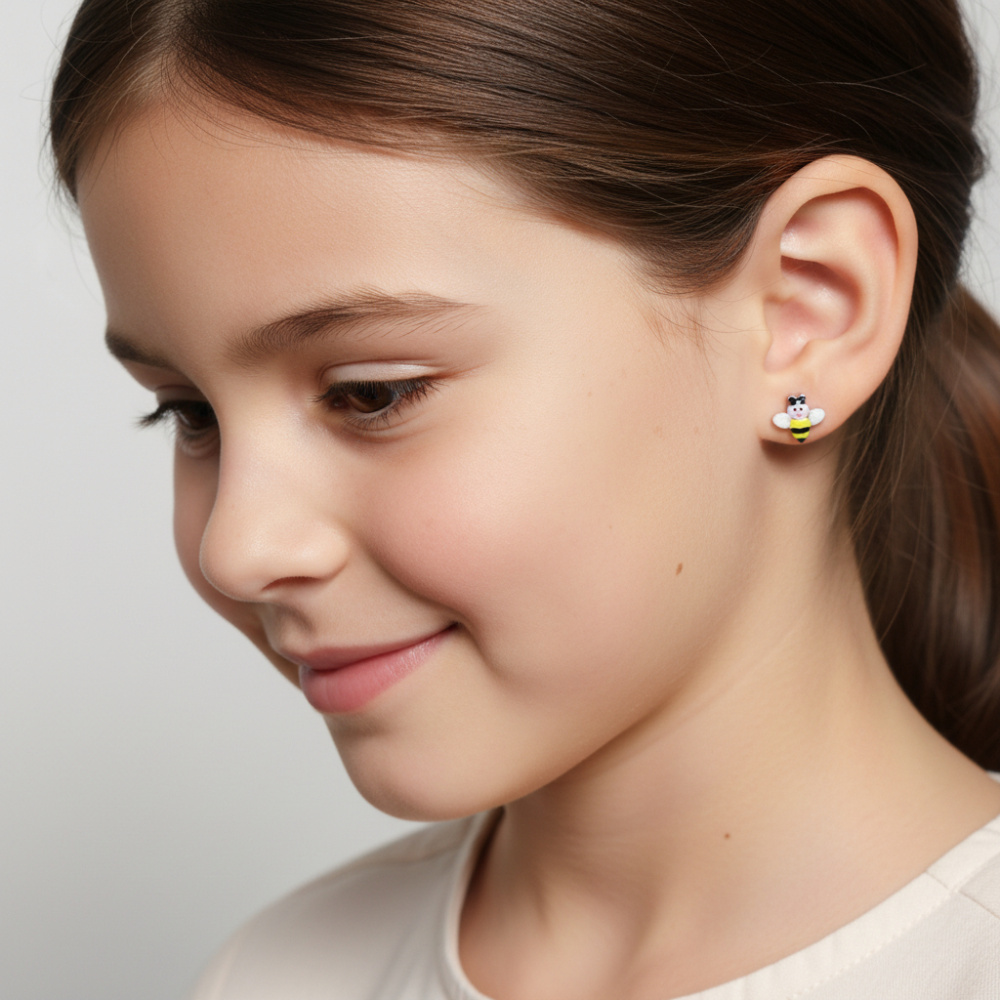 Boucles d'oreilles puces en argent pour enfant en forme d'abeille avec émail
