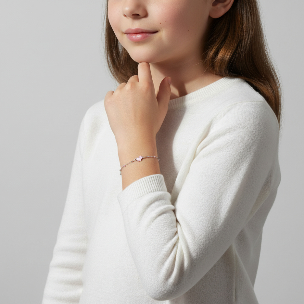 Le bracelet enfant en argent rhodié, avec son adorable lapin en émail rose et ses perles en émail rose, est une pièce qui symbolise la candeur et la joie de l'enfance. La présence du lapin souvent associé à la chance et à la bienveillance transforme ce bijou en un précieux porte-bonheur. La chaîne en maille forçat offre une texture classique et chic et une durabilité adaptée au port quotidien des enfants.