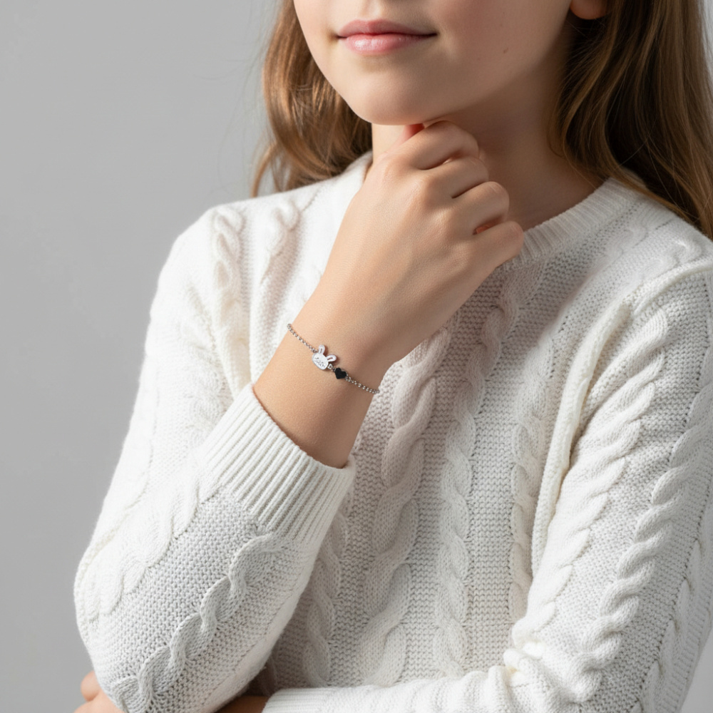 Ce bracelet en argent rhodié orné d'une tête de lapin en émail et d'un petit coeur est un bijou délicat qui incarne l'innocence des enfants. La tête de lapin en émail apporte un caractère ludique et joyeux qui évoque l'univers enchanté des contes pour enfants tandis que le petit coeur procure une note de tendresse. La chaîne en maille jaseron offre une texture légère et délicate, parfaitement adaptée au petit poignet des enfants