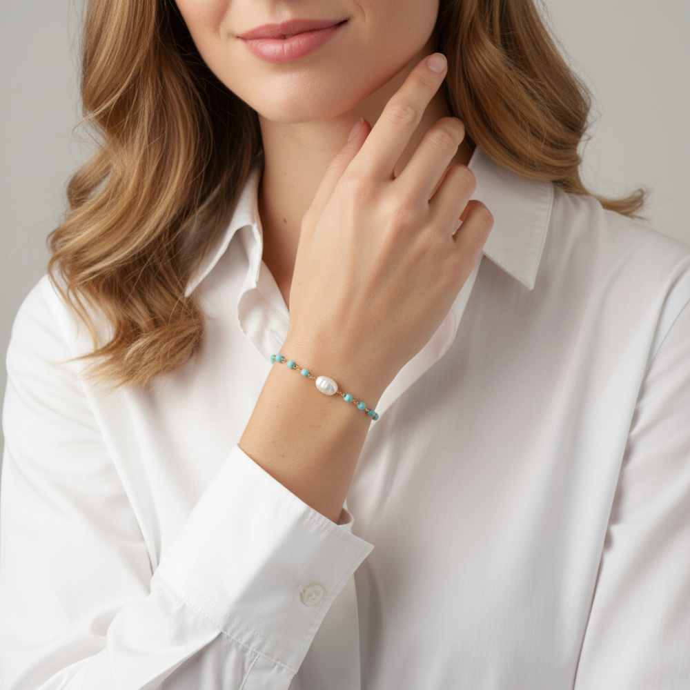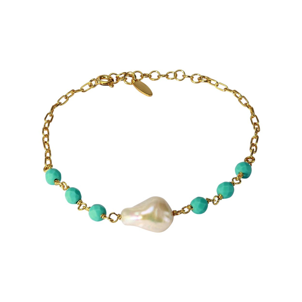 D'inspiration océanique avec ses douces couleurs turquoise, ce bracelet en argent doré donne un coup de pep et de glamour à vos tenues. Il est délicatement agrémenté d'une chaîne à maille aérée qui confère un esprit de légèreté. Le bijou est parsemé de six perles facettées bleu turquoise qui entourent une perle blanche en forme de poire. Il est parachevé par un système d'attache constitué d'un anneau ressort qui garantit confort et sécurité.