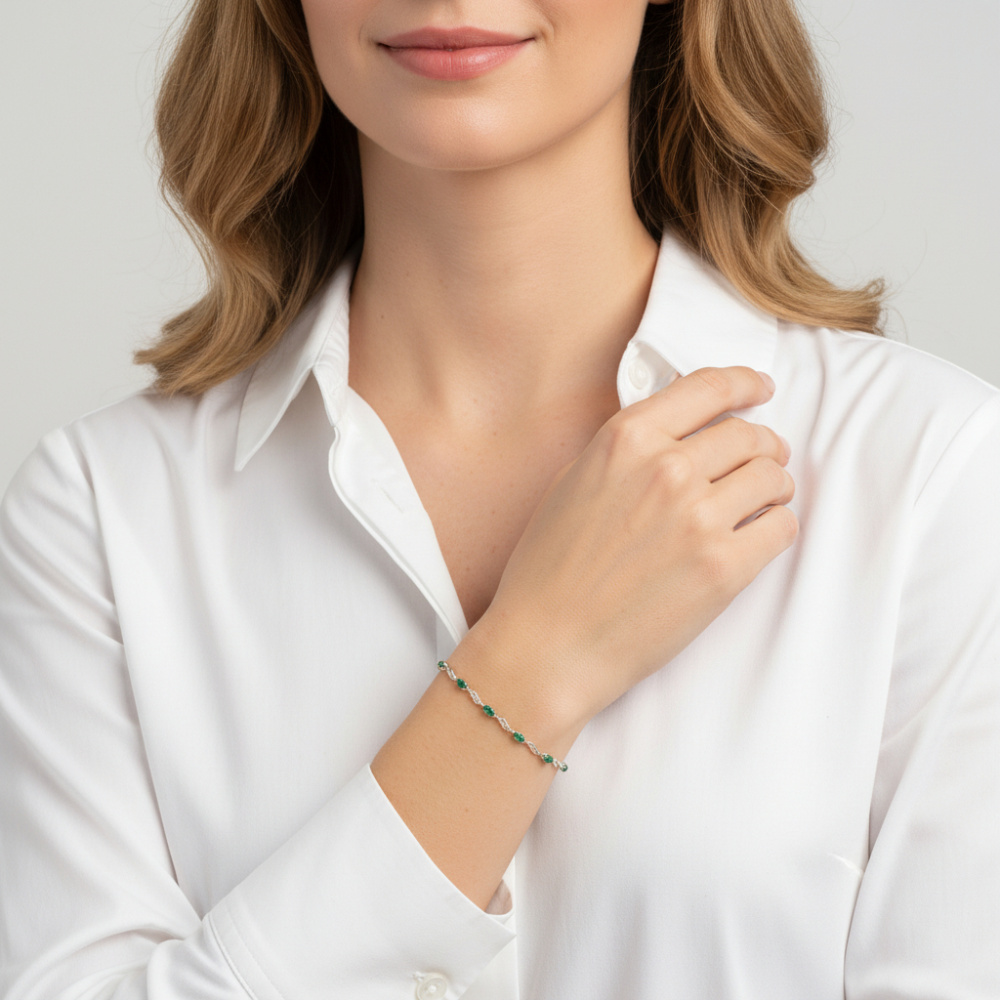 Bracelet composé d'émeraudes ovales de 5x3mm serties à griffes et de diamants sertis dans un motifs en forme de feuille