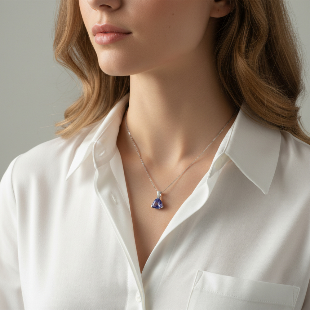 Ce pendentif incarne l'alliance parfaite entre l'élégance intemporelle de l'or blanc et la rareté envoûtante de la tanzanite.