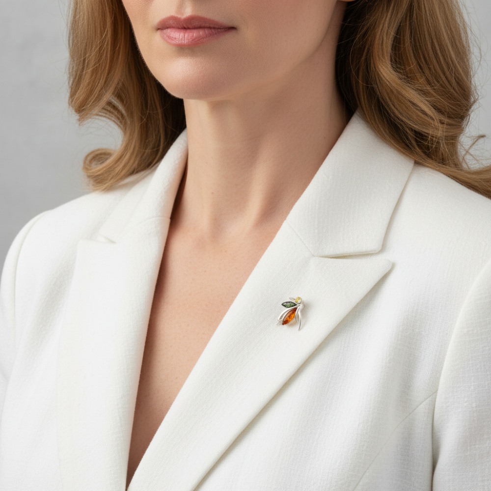 Broche en argent 925 de forme de fée composée d'une ambre cognac forme navette de 5x13mm, une ambre verte forme navette de 4x10mm et d'une ambre jaune ronde de 4mm de diamètre