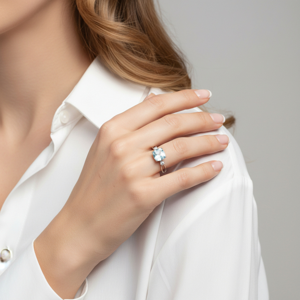 Avec cette bague en argent rhodié 925, l'élégance rencontre la simplicité. Une topaze bleue traitée coussin se dévoile ici dans toute sa splendeur, ses teintes azurées évoquant une mer calme et cristalline. Sa forme douce et arrondie est parfaitement mise en valeur par deux oxydes de zirconium blancs, ronds et éclatants, placés de part et d'autre de la pierre centrale. La monture épurée aux lignes délicates est ajourée sur les côtés pour plus de style et de fluidité.
