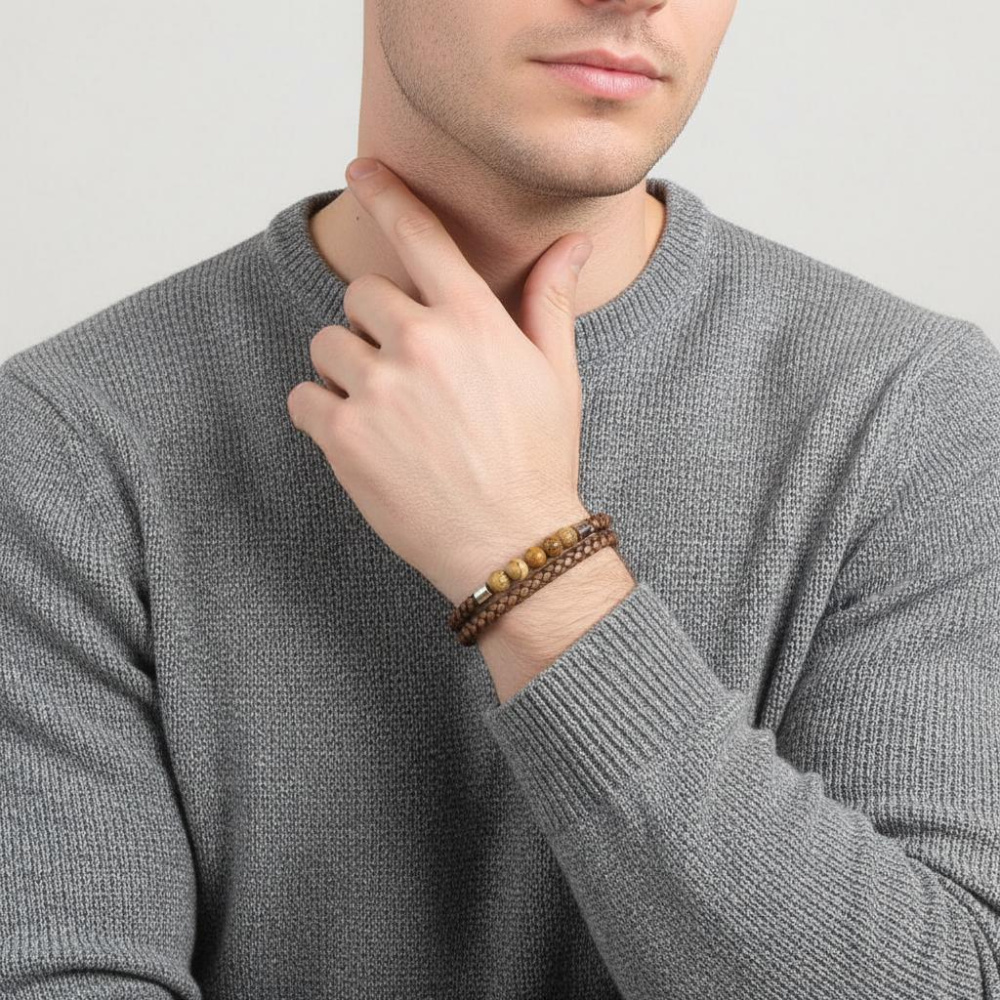 Bracelet Homme Multi-rangs Cuir Bovin Marron et Jaspe