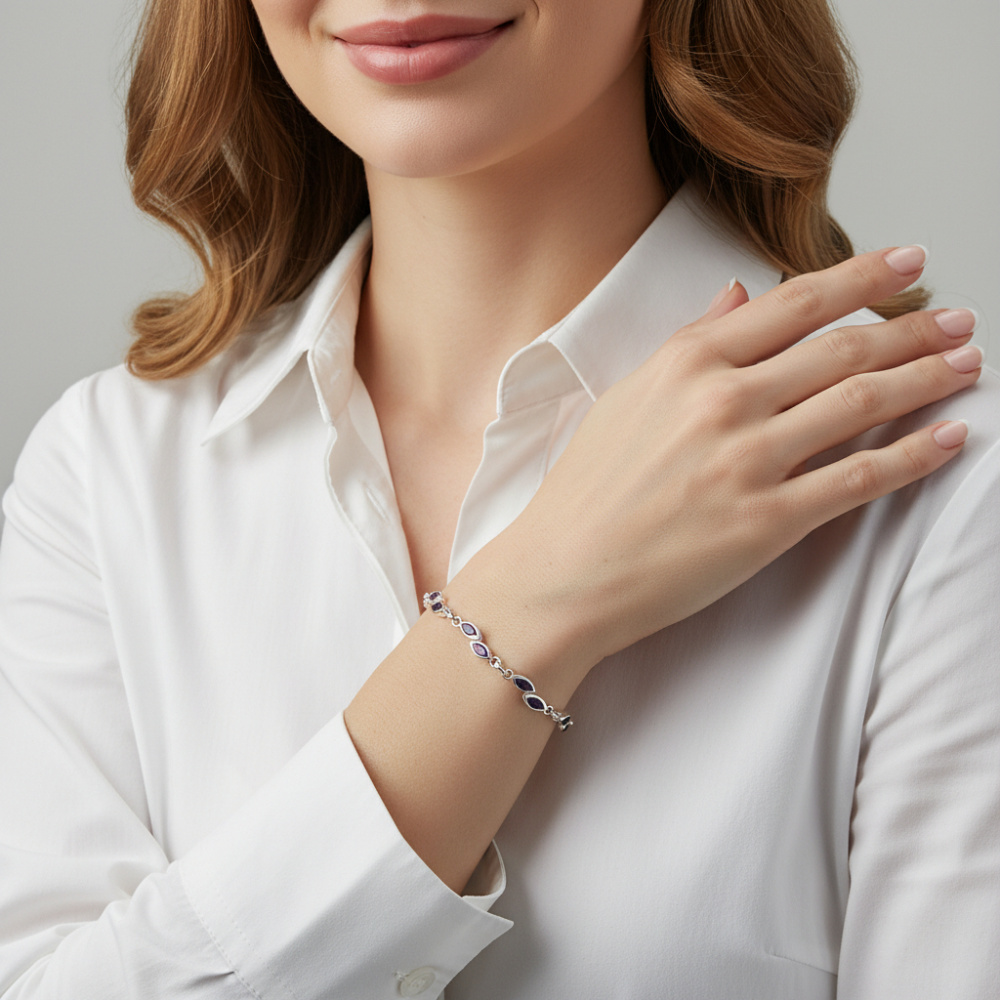 Affirmez votre style avec ce bracelet en argent 925 sublimé par de magnifiques améthystes taillées en navette.