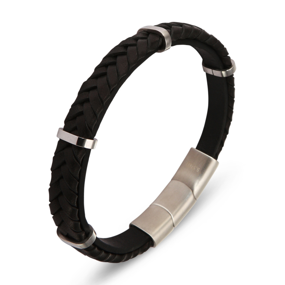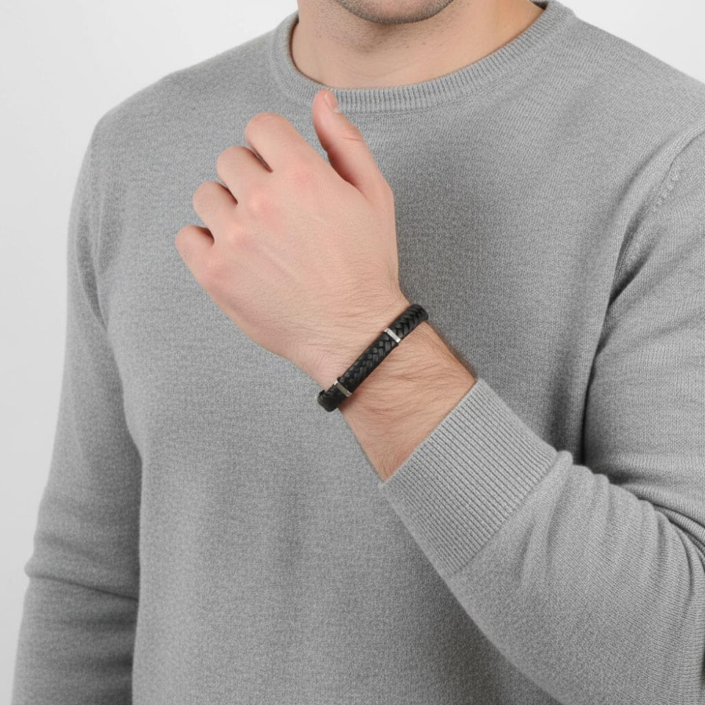 Bracelet Homme Acier noir Cuir tressé - Ref : 57274