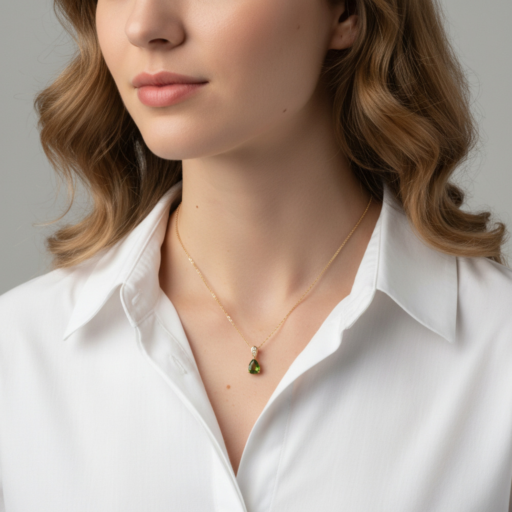 Pendentif en Or Blanc 750 serti d'un Saphir Vert Poire de 8x6mm et de 3 diamants