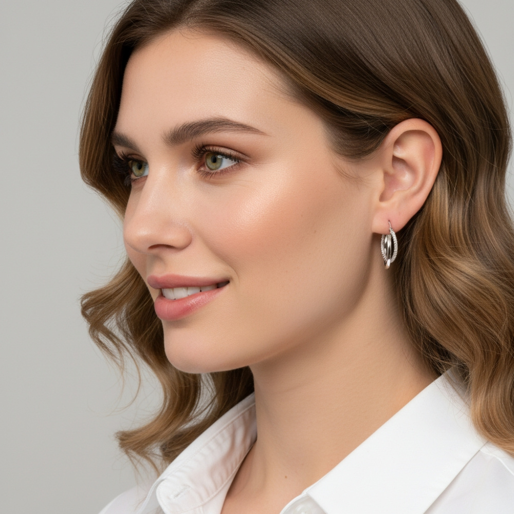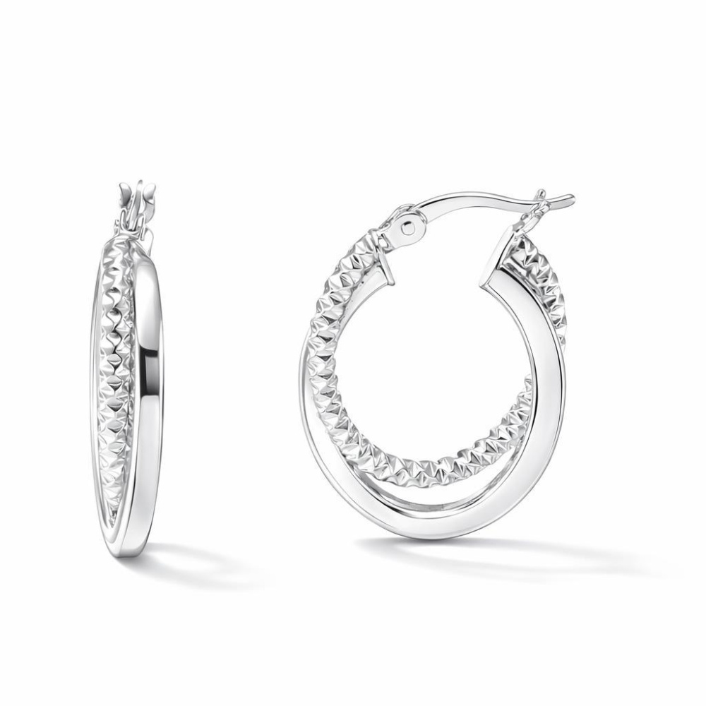 Chaque boucle se distingue par un anneau texturé de section ronde, entrelacé harmonieusement avec un anneau de section carrée.