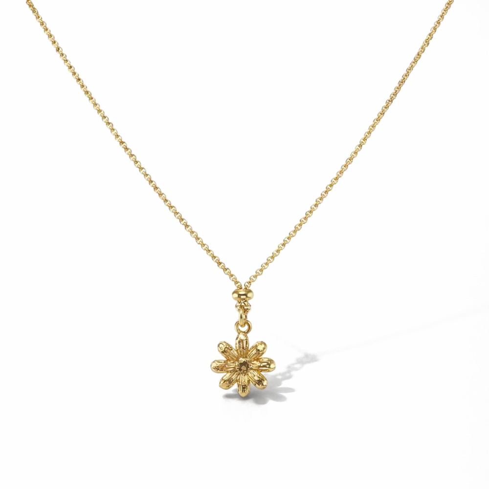 La délicate chaîne maille jaseron de 1,2 mm met en valeur un pendentif en forme de fleur, finement ciselé, offrant une harmonie parfaite entre modernité et classicisme.