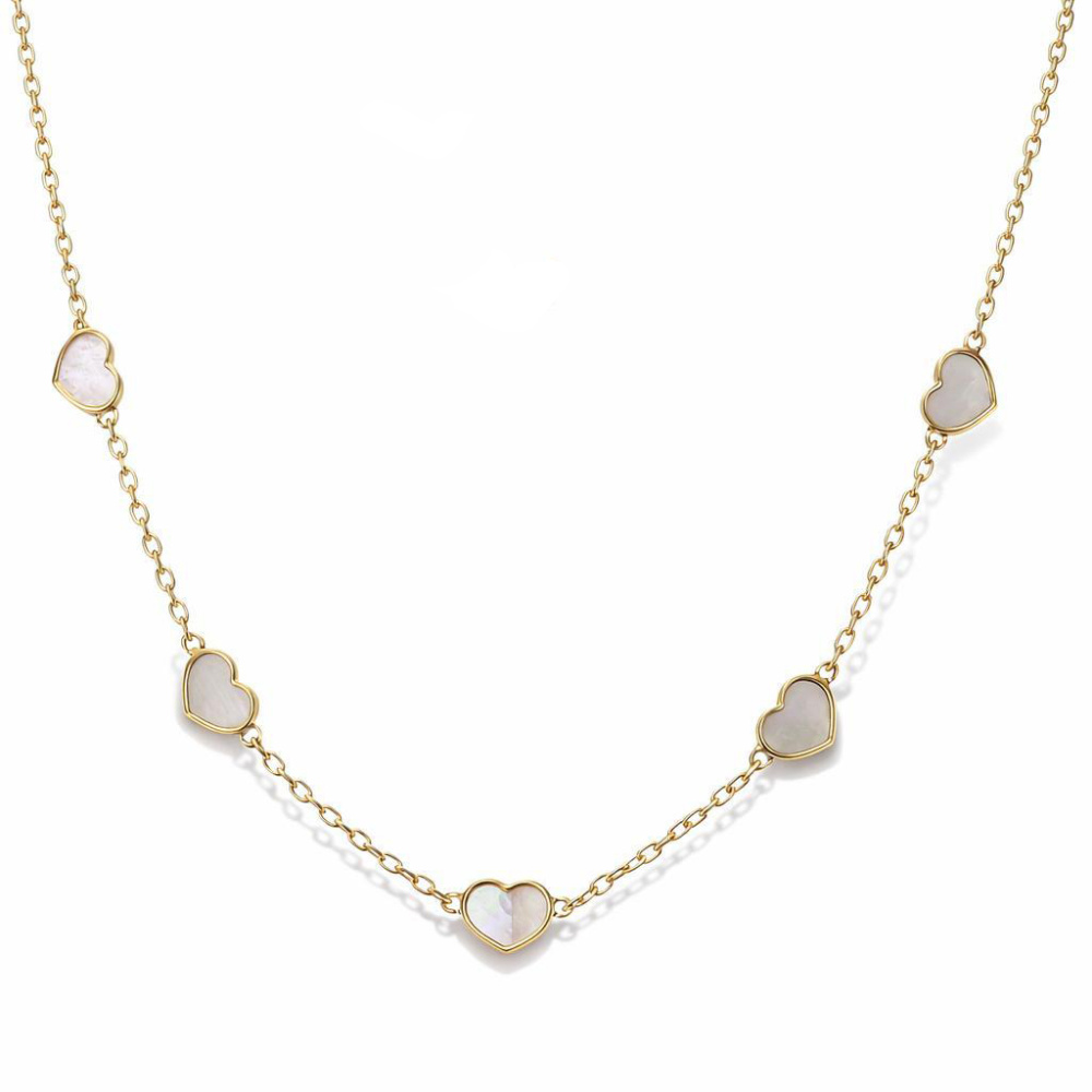 Ce collier délicat en argent 925 doré se distingue par son design raffiné, mettant en scène cinq cœurs subtilement sertis de nacre.