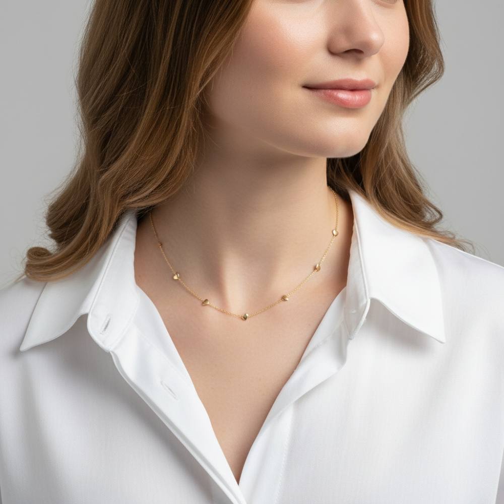 Subtilement conçu, il arbore une chaîne en maille forçat, d'une finesse remarquable, qui soutient délicatement sept cœurs finement façonnés.