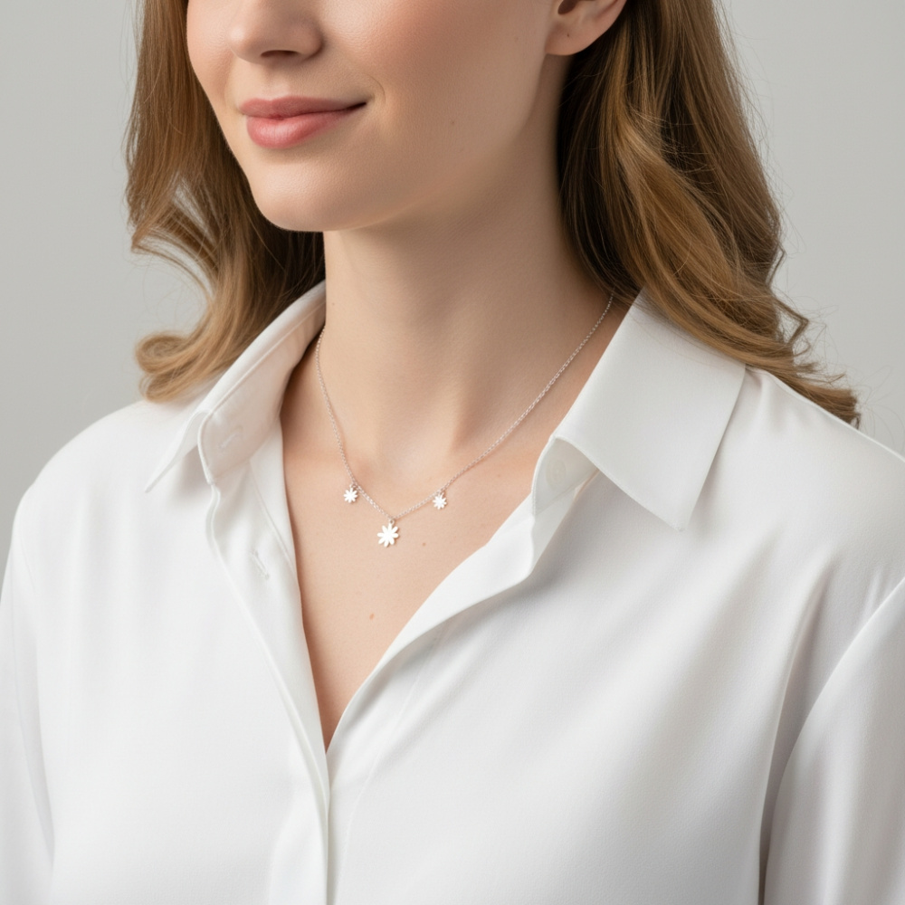 Ce collier en argent 925 rhodié incarne la délicatesse et l'élégance grâce à ses trois fleurs finement façonnées qui captivent le regard.