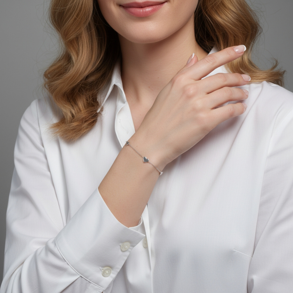 Élégance et finesse caractérisent ce bracelet en argent 925 rhodié, magnifiquement orné de deux cœurs délicats et d'un cœur central rayé.