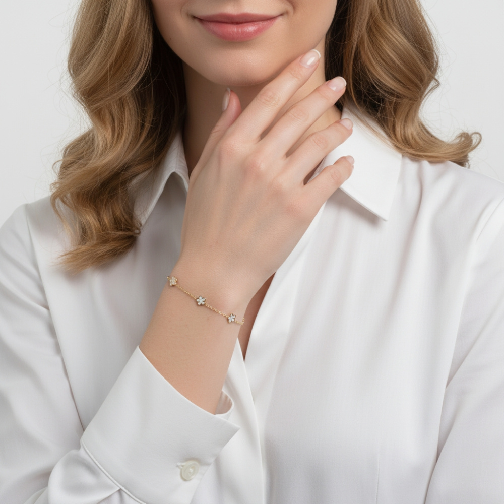 Découvrez ce bracelet en argent 925 doré, délicatement orné de cinq fleurs élégantes, chaque pétale serti de nacre iridescente.