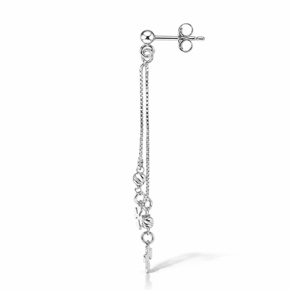 Boucles d'oreilles pendantes en argent 925 rhodié composées de 2 trèfles porte bonheur dont le plus grand mesure 7mm de large, 2 boules d'argent ciselées de 3mm de diamètre et 2 chaînettes maille vénitienne de 0,7mm de large