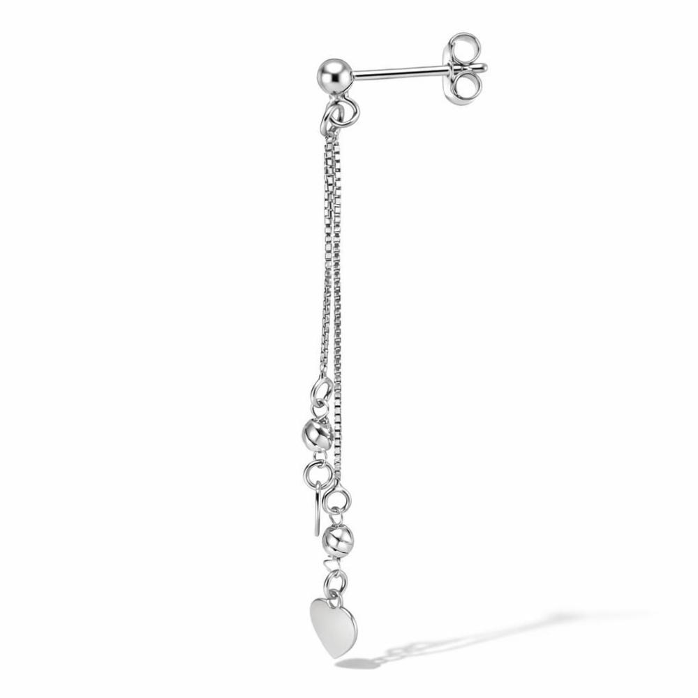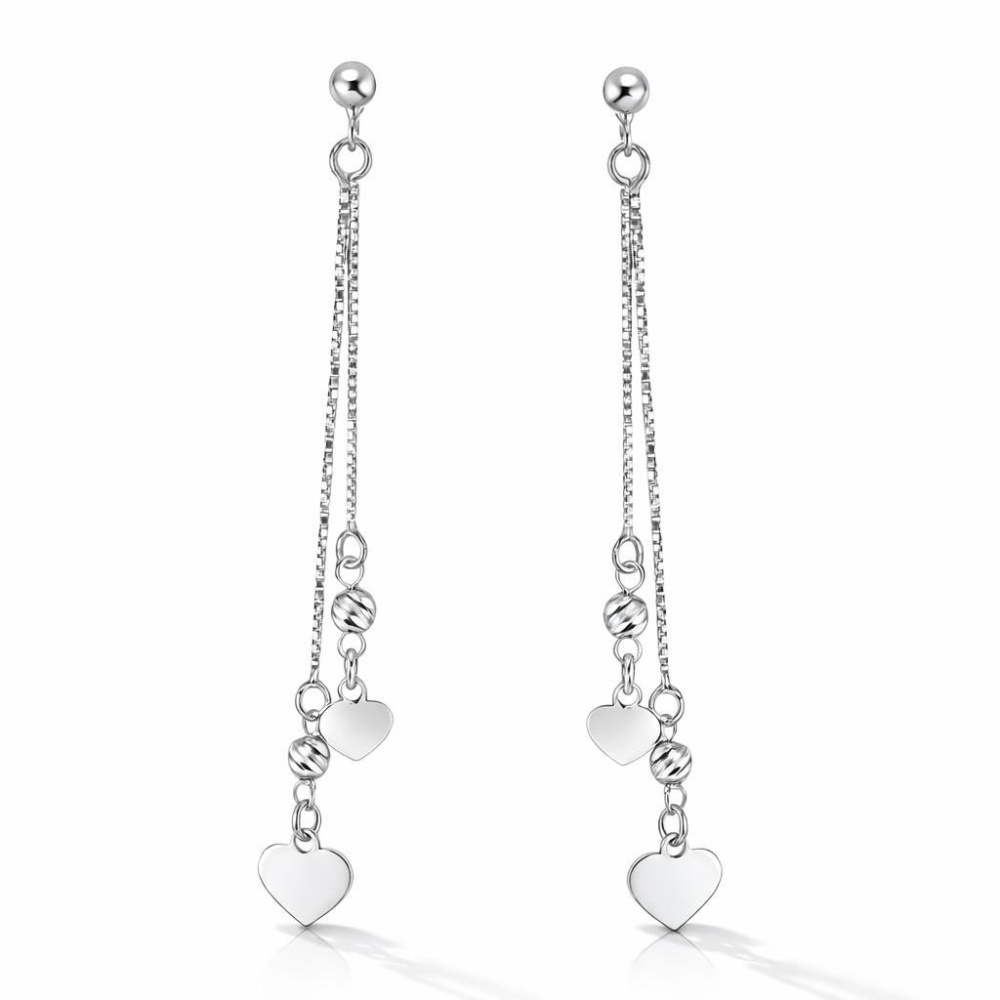 Boucles d'oreilles pendantes en argent 925 rhodié composées de 2 coeurs dont le plus grand mesure 6x6mm, 2 boules d'argent ciselées de 3mm de large et 2 chaînettes maille vénitienne de 0,7mm de large