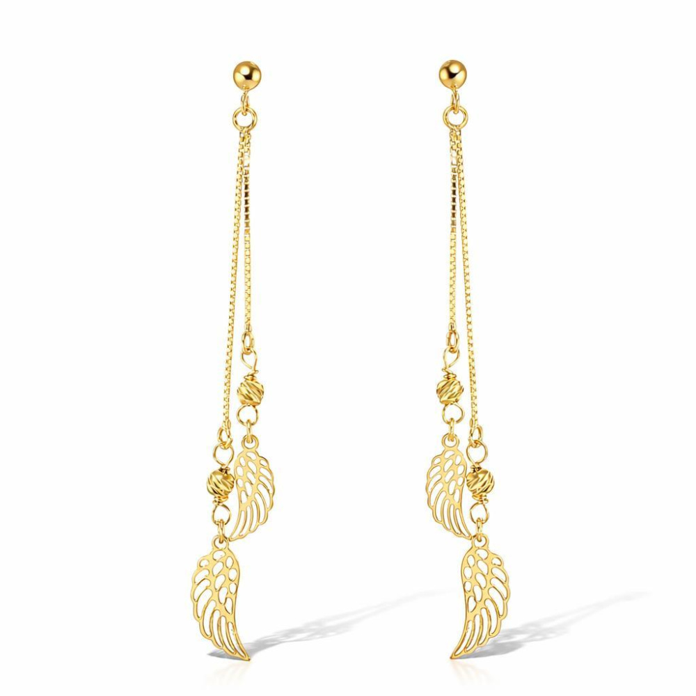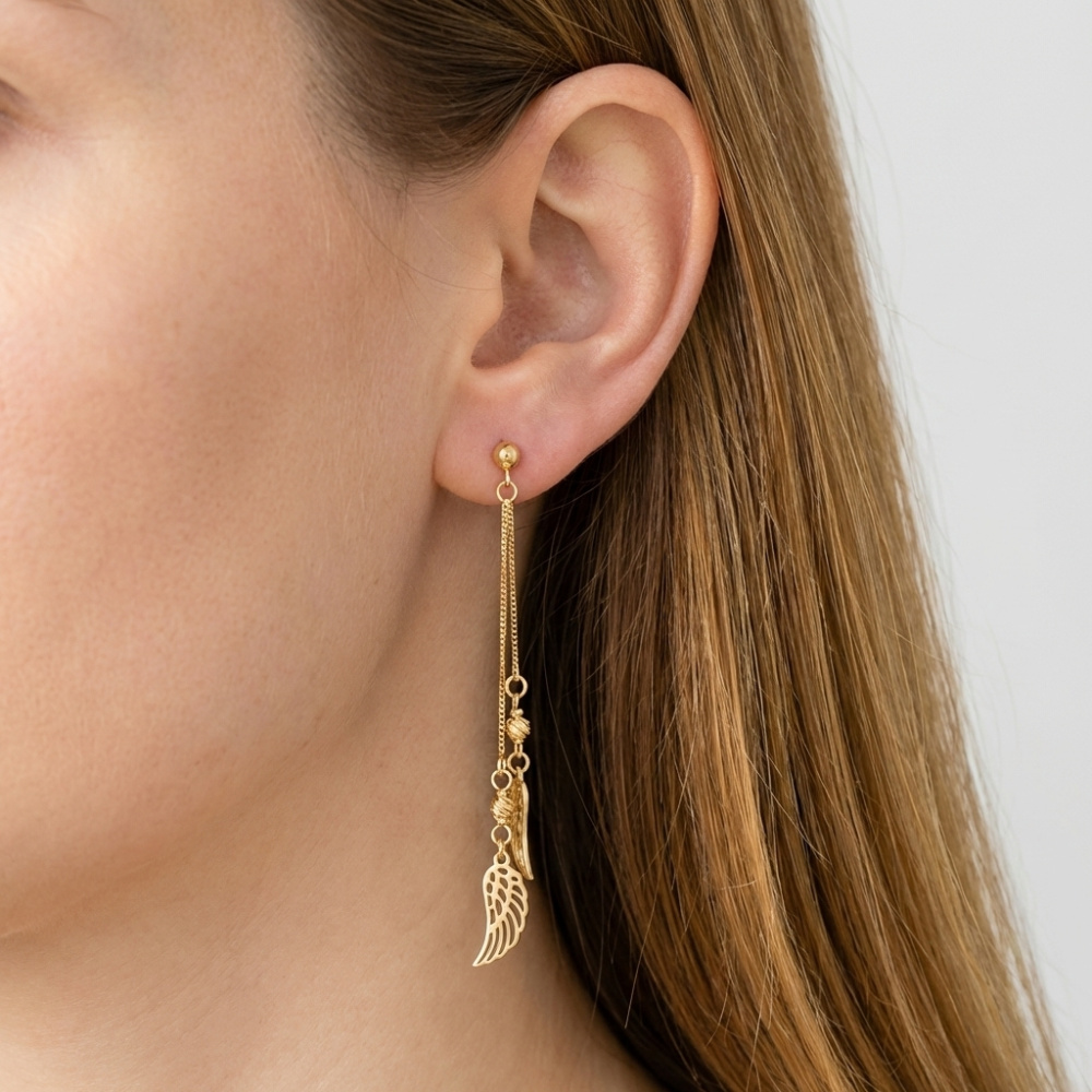 Boucles d'oreilles pendantes en argent 925 rhodié composées de 2 ailes dont la plus grande mesure 6x12mm, 2 boules ciselées de 3mm de large et 2 chaînettes maille vénitienne de 0,7mm de large