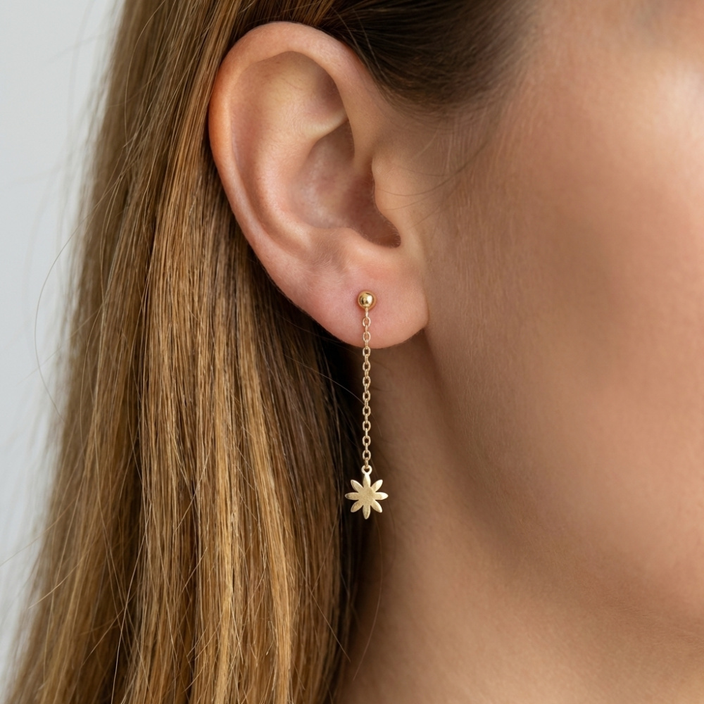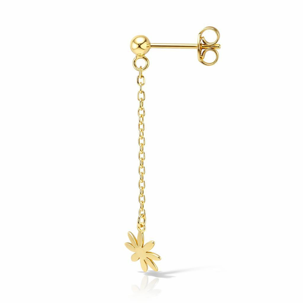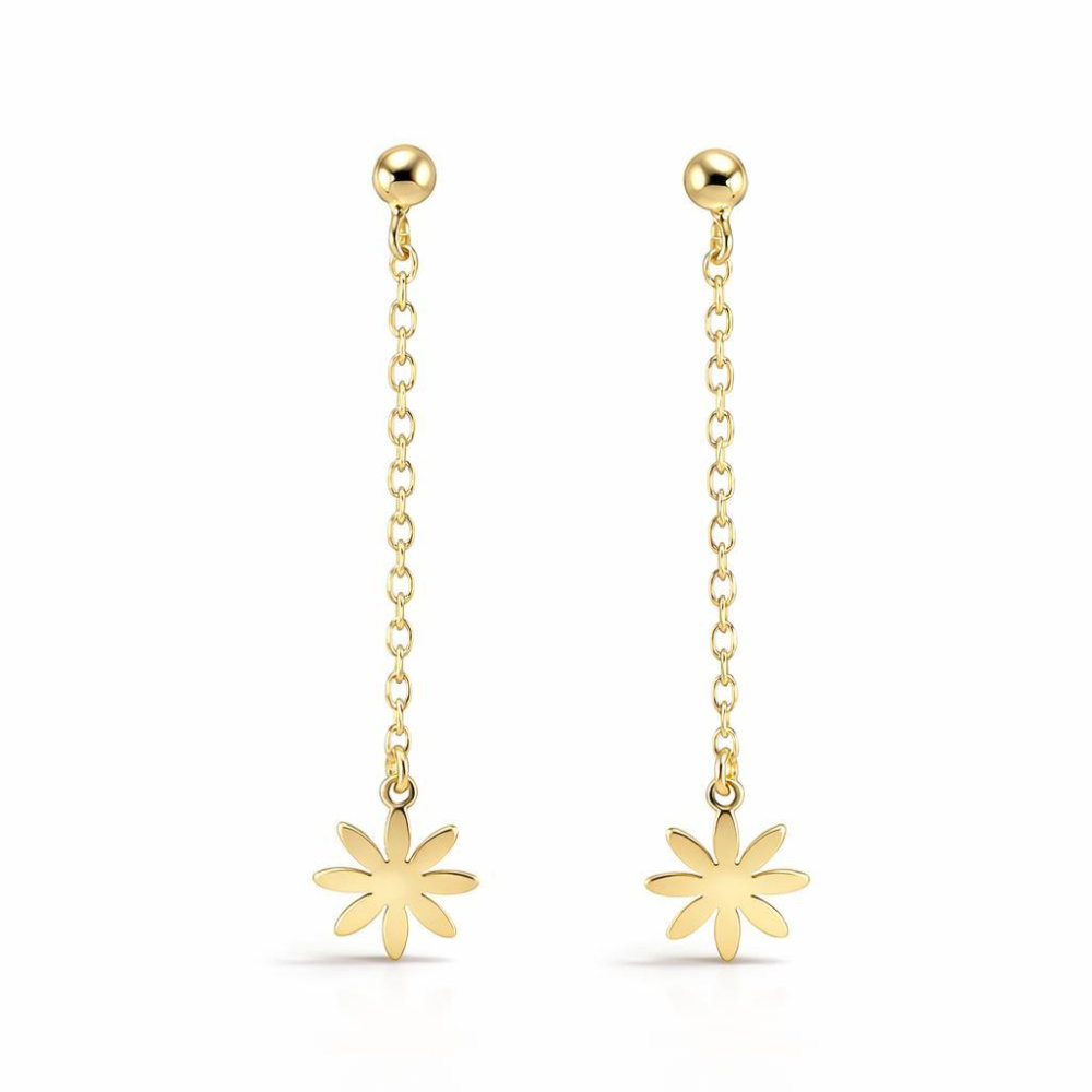 Boucles d'oreilles pendantes en argent 925 doré composées d'une fleur de 8mm de large et d'une chaînette maille forçat de 1,3mm de large