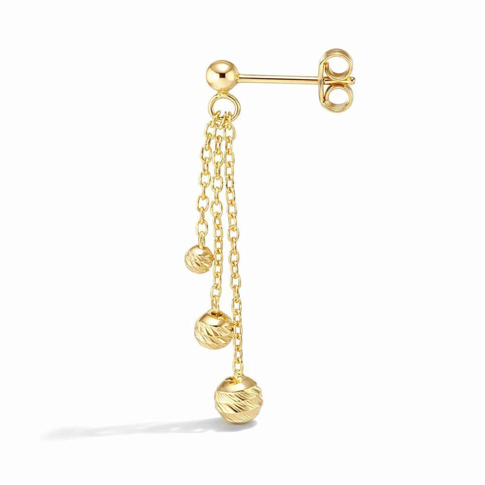 Boucles d'oreilles pendantes en argent 925 doré composées de 3 chaînettes maille forçat de 1,3mm de large et 3 boules en argent doré ciselées de 3, 4 et 5mm de diamètre