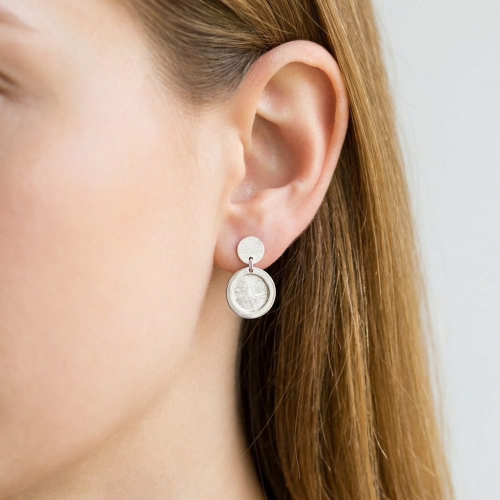 Boucles d'oreilles pendantes en argent 925 rhodié composées de 2 disque en argent brossé dont le plus grand mesure 11mm de diamètre