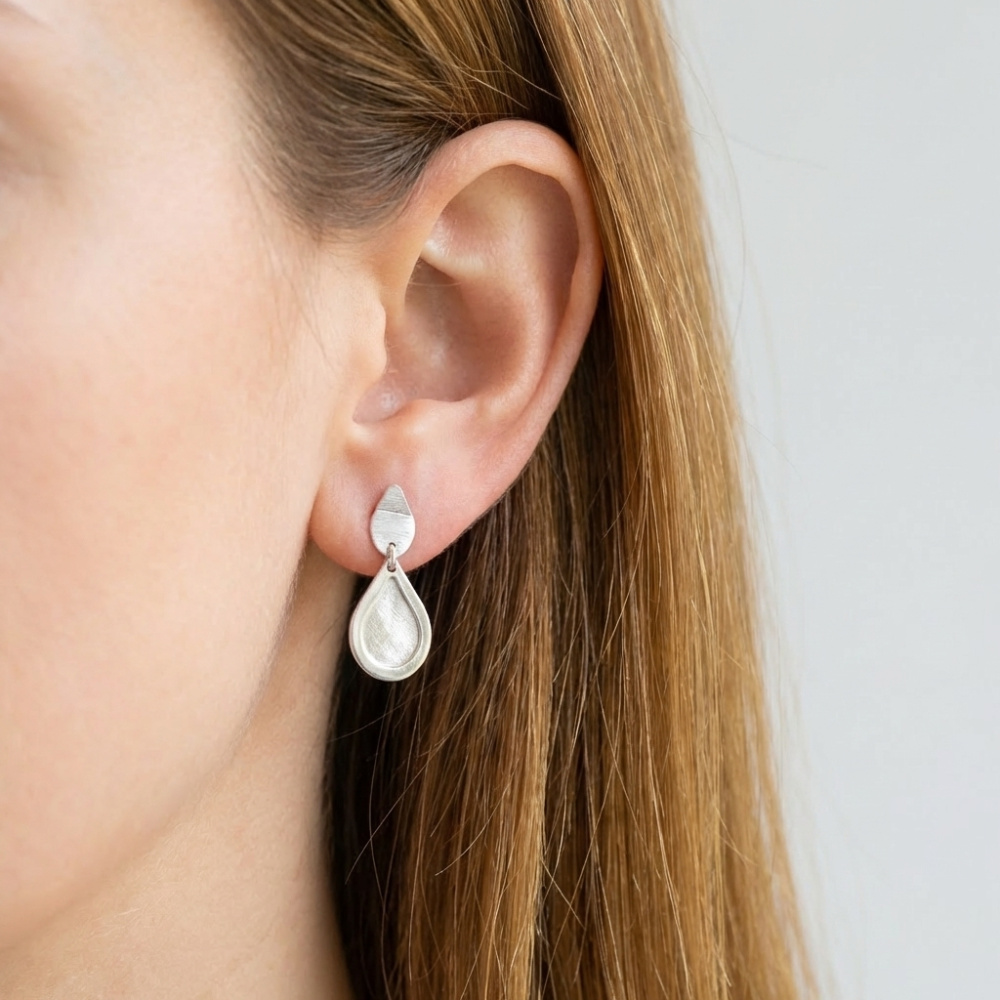 Boucles d'oreilles pendantes en argent 925 rhodié composées d'une goutte lisse et d'une goutte en argent brossé de 9x13mm
