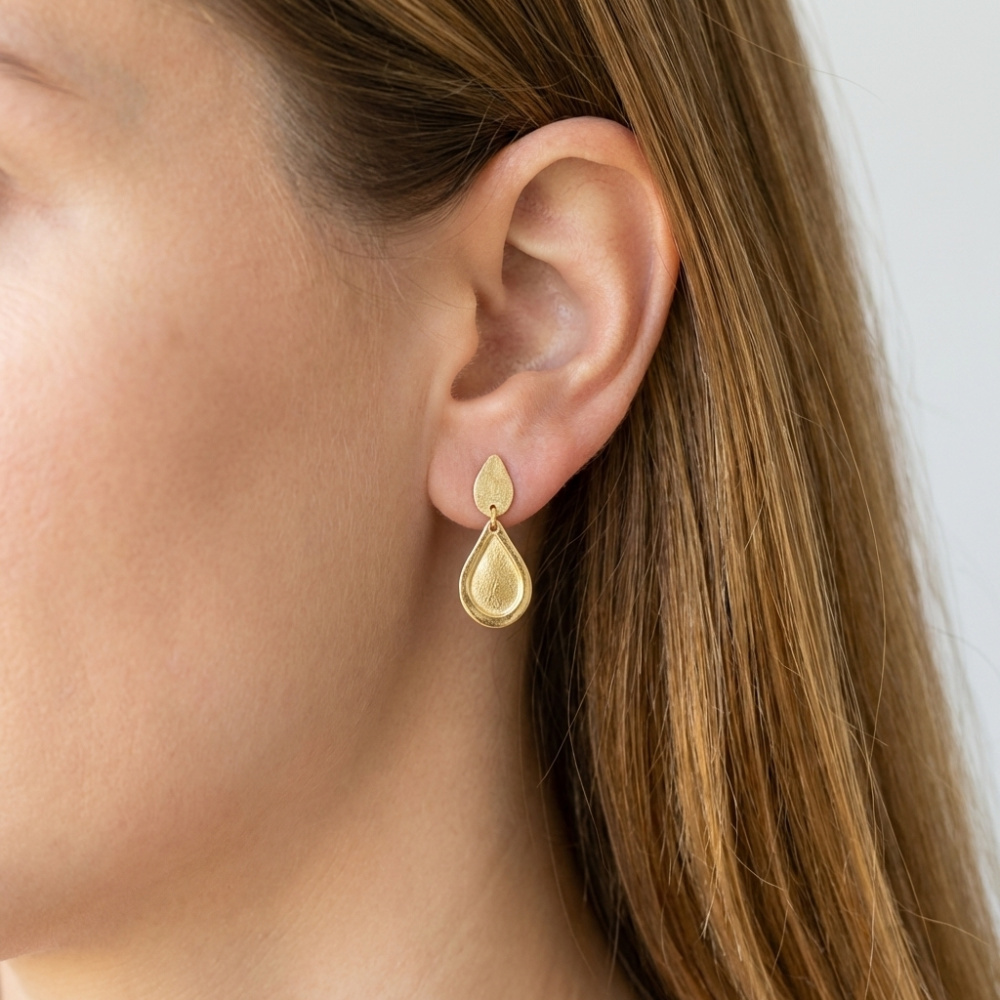 Boucles d'oreilles pendantes en argent 925 doré composées d'une goutte lisse et d'une goutte en argent brossé de 9x13mm
