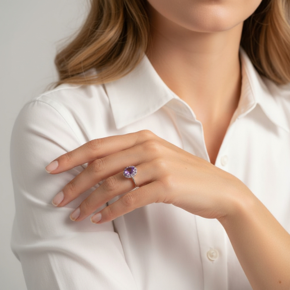 Bague Argent 925 Améthyste sertie d'une pierre de 9x7mm et de 12 pierres de 2mm