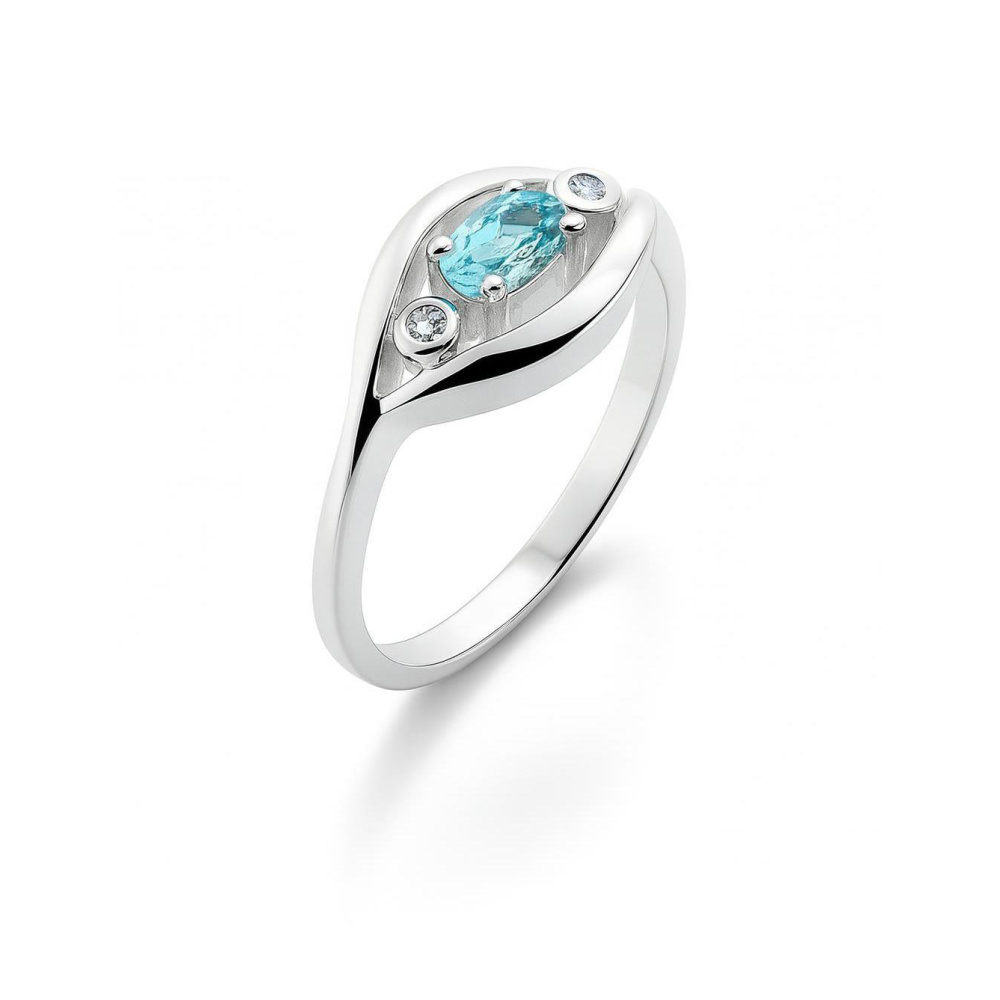 Bague Argent 925 Topaze bleue traitée, modèle fantaisie serti d'une pierre ovale de 5x3mm et de deux petites pierres